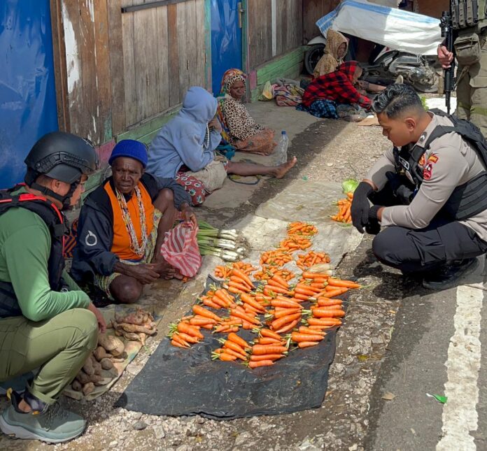 Paniai, Papua Tengah, Newsraflesiaindonesia- Personel Operasi Damai Cartenz melaksanakan kegiatan belanja hasil bumi sekaligus menyapa mama-mama penjual sayuran di Jl. Enarotali, Distrik Paniai Timur, Kabupaten Paniai, pada Sabtu (27/9/2025) pukul 08.00 WIT hingga selesai. Kegiatan yang dipimpin oleh Ipda Syahrir Mahyudin, S.H., bersama Bripda Irgi Alamsyah ini bertujuan untuk mendukung perekonomian lokal sekaligus mempererat hubungan emosional antara aparat keamanan dengan masyarakat setempat.