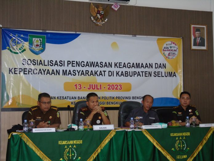 News Raflesia Indonesia. Upaya antisipasi terhadap potensi konflik berlatar belakang agama yang bersumber dari aliran kepercayaan dan aliran keagamaan masyarakat, Kesbangpol Provinsi Bengkulu bersama Kejaksaan Tinggi Bengkulu melaksanakan Sosialisasi Pengawasan Aliran Kepercayaan dan Aliran Keagamaan Masyarakat di Kabupaten Seluma (13/06/23) di Aula Kejaksaan Negeri Seluma.