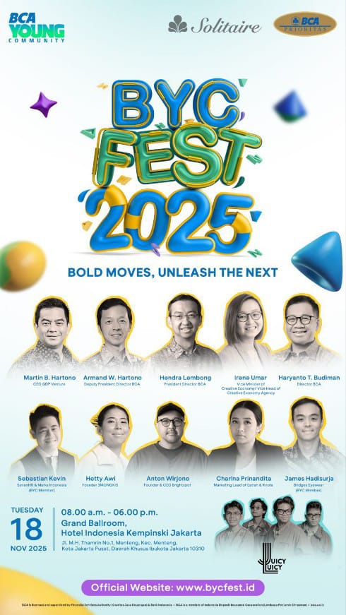 Jakarta, news-raflesia-indonesia— Perhelatan eksklusif BYC Fest 2025 kembali digelar pada Selasa, 18 November 2025 di Grand Ballroom, Hotel Indonesia Kempinski Jakarta. Acara yang berlangsung dari pukul 08.00 hingga 18.00 WIB ini menghadirkan jajaran tokoh inspiratif dari berbagai sektor, mulai dari perbankan, teknologi, ekonomi kreatif, hingga para pelaku industri kreatif nasional.