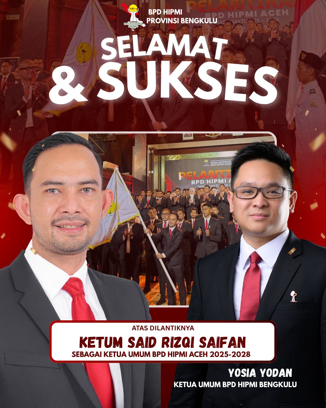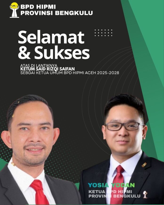 news-raflesia-indonesia, – Ketua Umum Badan Pengurus Daerah Himpunan Pengusaha Muda Indonesia (BPD HIPMI) Provinsi Bengkulu, Yosia yodan, menyampaikan ucapan selamat atas pelantikan Ketua Umum BPD HIPMI Aceh, Said Rizqi Saifan, untuk masa bakti 2025–2028. Acara pelantikan berlangsung di Anjong Mon Mata, Meuligoe Gubernur Aceh, pada Minggu lalu (2/11) dengan penuh semangat kebersamaan dan optimisme.