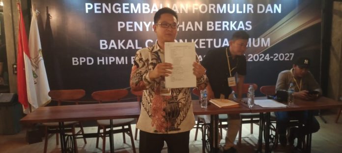 Tahapan pemilihan Ketua Umum BPD Himpunan Pengusaha Muda Indonesia (HIPMI) Bengkulu periode 2024-2027 semakin dekat dengan momen penting, yakni pengembalian formulir dan penyerahan berkas bakal calon. Pada hari ini, Selasa 29 Oktober 2024 Yosia Yodan, salah satu bakal calon ketua umum BPD HIPMI, secara resmi mengembalikan formulir dan menyerahkan seluruh berkas persyaratan administrasi dan juga Uang dalam Bentuk Cek sebesar 150 juta kepada panitia pemilihan diKaba Cofee Kota Bengkulu.