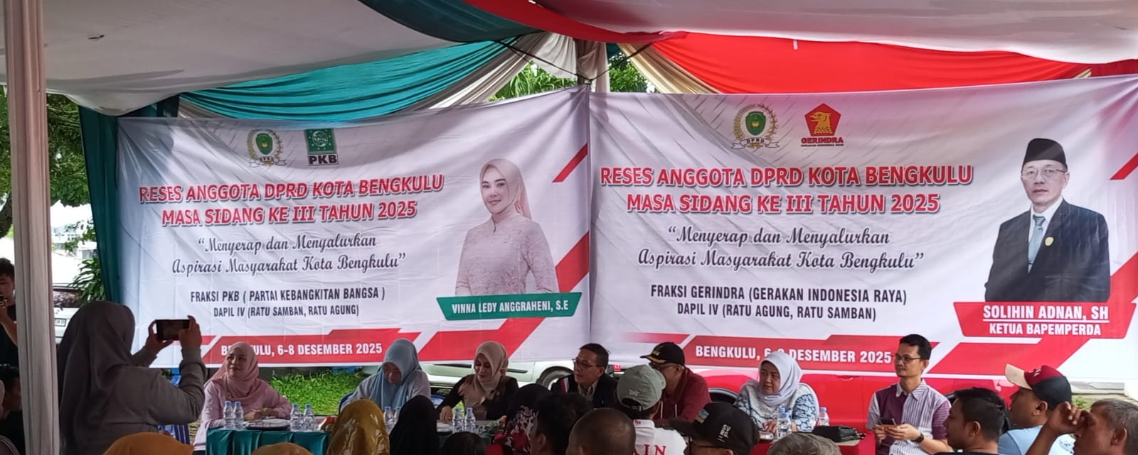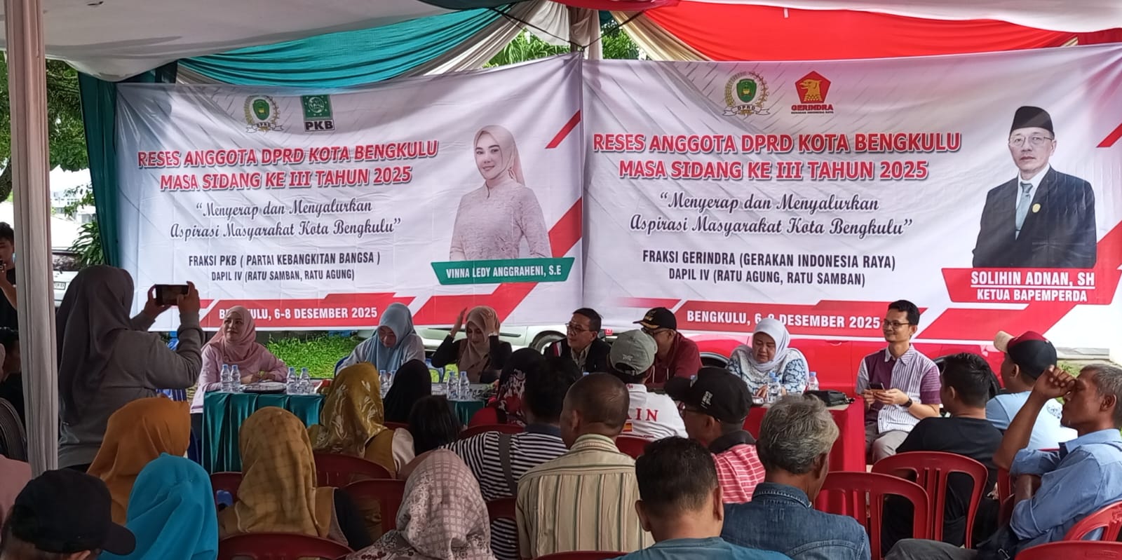 news-raflesia-indonesia, Bengkulu – Anggota DPRD Kota Bengkulu, Solihin, S. H Adnan dari Partai Gerakan Indonesia Raya (Gerindra) dan Vinna Ledy Anggraheni, S. E  dari Partai Kebangkitan Bangsa (PKB), melaksankan kegiatan Reses Masa Sidang III Tahun 2025, daerah pemilihan IV yang digelar di Halaman Kantor Camat Ratu Agung, Minggu (7/12) dengan kondisi hujan deras, namun Keduanya hadir untuk mendengar secara langsung kebutuhan warga sekaligus memastikan aspirasi tersebut dapat diperjuangkan di tingkat legislatif.