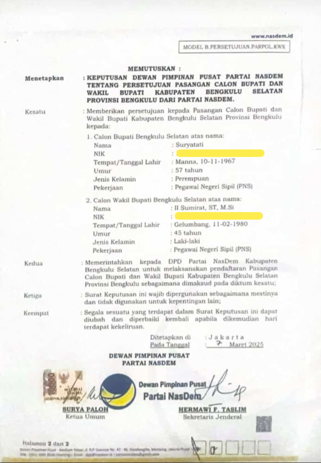 Dewan Pimpinan Pusat (DPP) Partai NasDem resmi memberikan persetujuan kepada pasangan Suryatati dan Li Sumirat sebagai calon Bupati dan Wakil Bupati Bengkulu Selatan dalam Pemilihan Kepala Daerah (Pilkada) 2024. Keputusan ini tertuang dalam Surat Keputusan DPP Partai NasDem yang ditandatangani oleh Ketua Umum Surya Paloh dan Sekretaris Jenderal Hermawi F. Taslim pada 7 Maret 2025 di Jakarta.