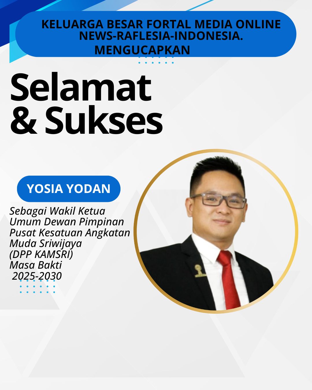 news-raflesia-indonesia, Bengkulu, – Semangat baru mengalir di tubuh Kesatuan Angkatan Muda Sriwijaya (KAMSRI). Yosia Yodan resmi dilantik sebagai Wakil Ketua Umum Dewan Pimpinan Pusat (DPP) KAMSRI periode 2025–2030 dalam pelantikan yang berlangsung di The Ballroom, Hotel Lumire, Jakarta Pusat, hari ini (26/10) dengan mengusung tema “Resentralisasi Semangat Kesriwijayaan dalam Bingkai Merah Putih.”